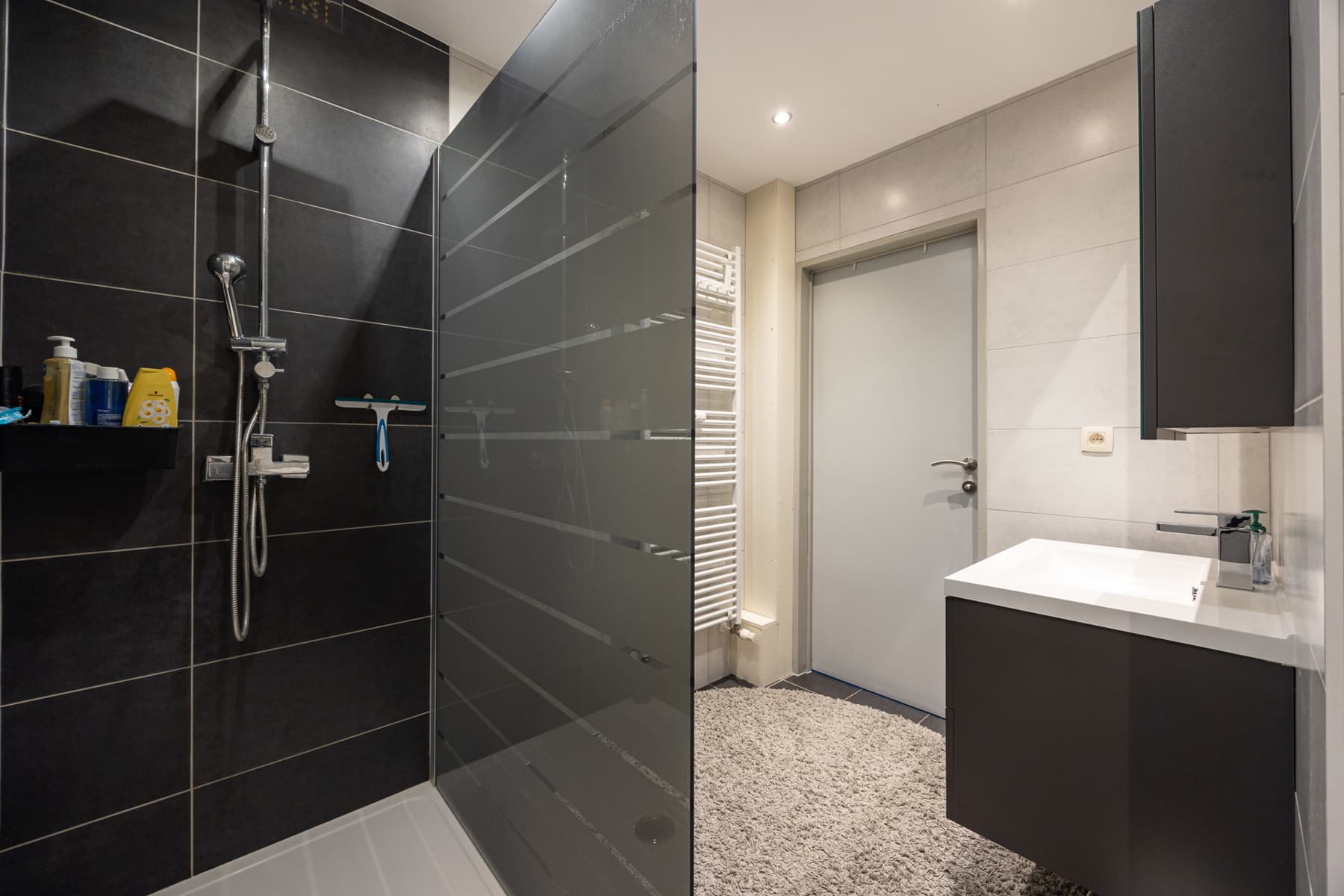 De badkamer werd ingericht met een regendouche, lavabo in meubel, handdoekdroger en aansluiting voor wasmachine.