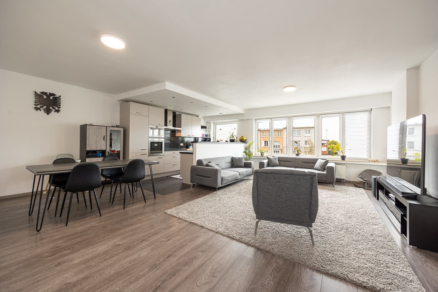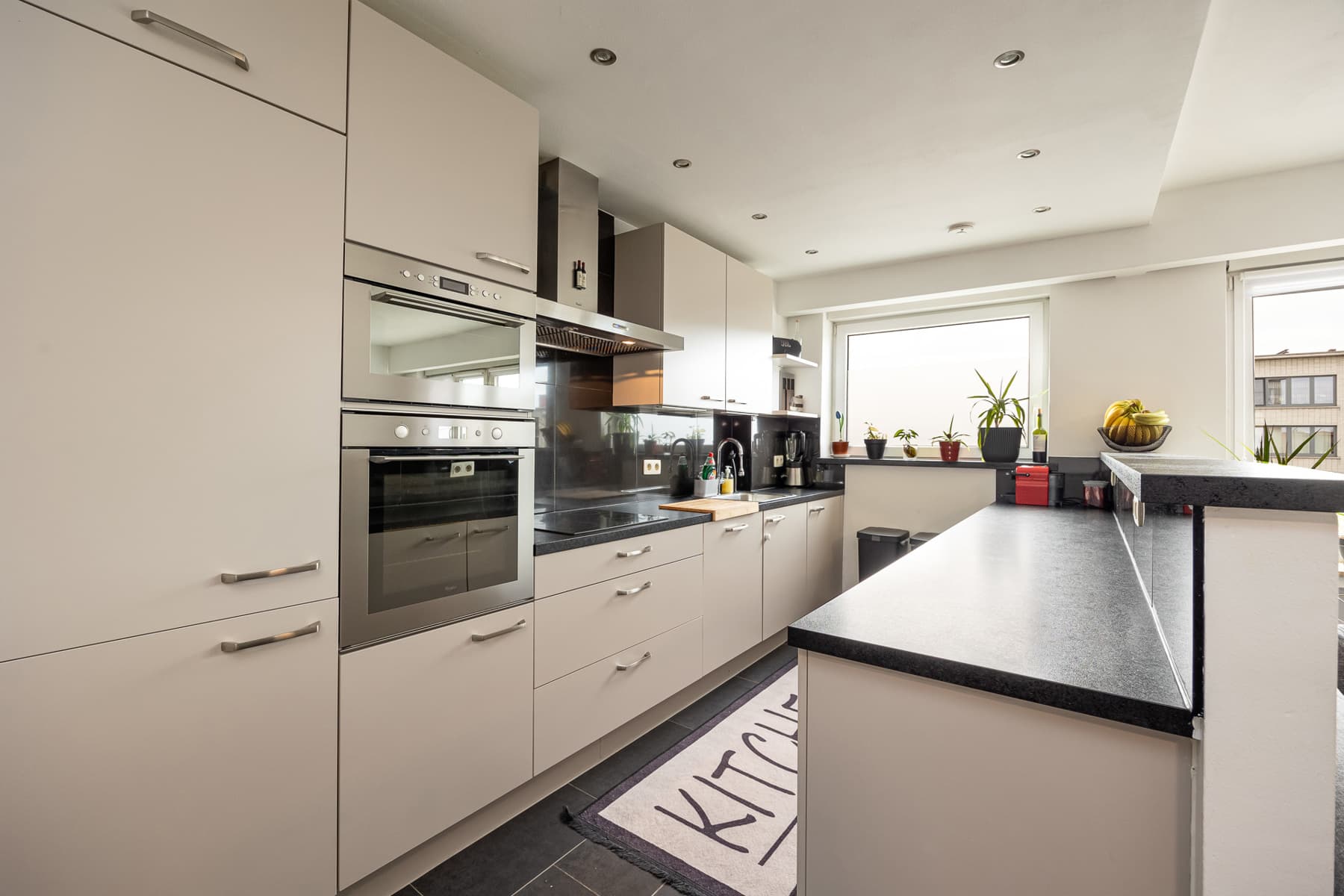 Bij binnenkomst geniet u van een ruime inkomhal met praktische vestiairekast en een gastentoilet met handenwasser. De inkom leidt naar de zeer ruime en lichtrijke woonkamer (47m²) op laminaatvloer, die aansluit op de open keuken. Deze is volledig uitgerust met een vaatwasser, spoelbak, koelkast met vriesvak, microgolfoven, heteluchtoven, vitrokeramische kookplaat en dampkap.