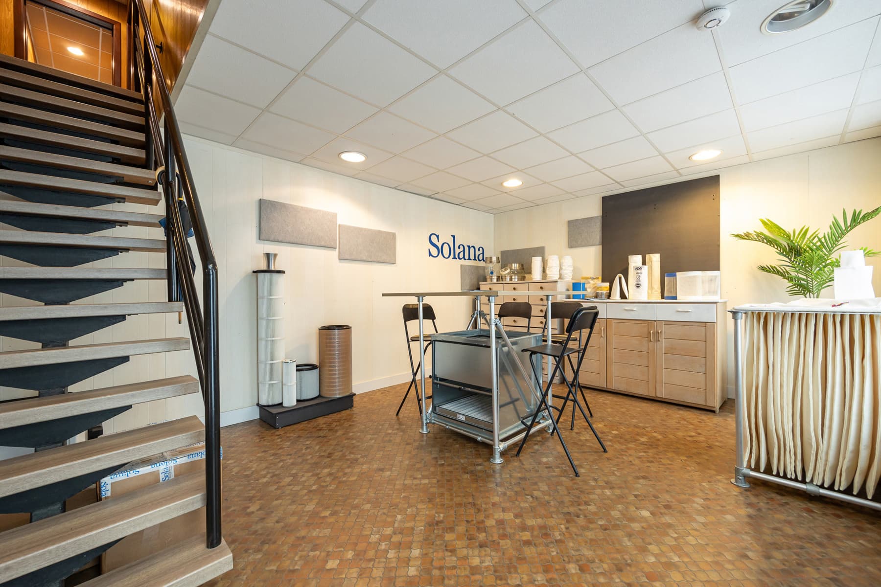 Inkom / toonzaal 23m² met toegang tot de werkplaats en trap naar de verdieping met de kantoren..